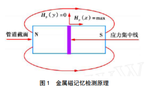 當鐵磁性構件受到外部載荷作用時(shí),受地球磁場(chǎng)激勵,在應力和變形集中區域會(huì )發(fā)生具有磁致伸縮性質(zhì)的磁疇組織定向和不可逆的重新取向,磁疇組織的重新取向會(huì )導致構件內部產(chǎn)生新的磁狀態(tài)。金屬構件表面的這種磁狀態(tài)記憶了微觀(guān)缺陷或應力集中的位 置,即所謂的磁記憶效應(圖 1)。