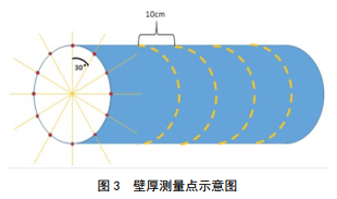 根據報告中GPS數據,定位埋地管道的腐蝕點(diǎn),取腐蝕點(diǎn)軸向±0.5 m作為測試管段開(kāi)挖驗證。以管道截面30°為1個(gè)壁厚測試點(diǎn),進(jìn)行環(huán)向標記,測試環(huán)線(xiàn)間距10 cm(圖 3)。每處腐蝕位置共計檢測120個(gè)壁厚數據并記錄。取壁厚最薄的數據對比磁應力檢測結果,驗證其準確性。