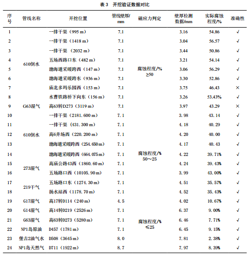 檢測出一級腐蝕點(diǎn)18處,二級腐蝕點(diǎn)544處,三級腐蝕點(diǎn)2 857處,對部分腐蝕點(diǎn)開(kāi)挖驗證,數據對比見(jiàn)表 3。