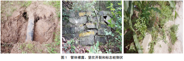 2015年10月,在普光氣田某輸氣管道宏觀(guān)檢查中,檢查水工保護設施928處,發(fā)現堡坎坍塌、開(kāi)裂及水土流失導致管體裸露共63處;檢查“三樁一牌” 648個(gè),倒伏、損壞10個(gè)(圖 1)。檢查情況及時(shí)反饋給相關(guān)管理部門(mén),坍塌、開(kāi)裂的堡坎已修復,裸露管段已填埋,倒伏的“三樁一牌”已扶正加固,同時(shí)巡檢方加強了穿跨越段和易沖刷部位的巡檢頻率,并做好巡回檢查記錄。