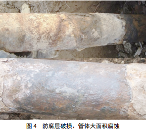 2016年6月,檢測油田本部某采油廠(chǎng)注水管道,在利用埋地管道防腐層檢測儀對防腐層進(jìn)行檢測評估時(shí),根據檢測異常數據開(kāi)挖驗證,發(fā)現管道防腐層破損、管體腐蝕嚴重(圖 4)。根據檢測結果提出建議:更換管段10 m,防腐層大修。