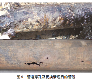某采油廠(chǎng)低含水原油外輸管道1999年10月投產(chǎn),管道規格Φ 159×6、材質(zhì)20#鋼,工作壓力0.9 MPa、工作溫度70 ℃,近年來(lái)管道穿孔頻繁。使用管道防腐層檢測儀配合“A”支架檢測防腐層絕緣性能時(shí),發(fā)現一處破損點(diǎn),經(jīng)開(kāi)挖驗證為管道現場(chǎng)穿孔(圖 5)。使用單位及時(shí)進(jìn)行了維修處理,避免了更大的經(jīng)濟損失和安全風(fēng)險。