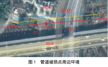 2018年8月14日,某成品油管道(簡(jiǎn)稱(chēng)A管道)90 km+420 m處被G60高速公路拓寬工程地質(zhì)勘探鉆破;破損點(diǎn)埋深21.2 m[1],破損段為定向鉆穿越管道,事發(fā)時(shí)管道處于停輸保壓狀態(tài)。