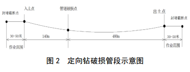 全部搶修施工在定向鉆入土點(diǎn)和出土點(diǎn)位置進(jìn)行(圖 2),關(guān)鍵施工技術(shù)是對破損管段兩端帶壓封堵、清管拉拔以及新管線(xiàn)回拖安裝等。