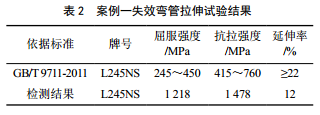 拉伸試驗結果如表 2所示,其中彎管段的屈服強度和抗拉強度遠高于標準規定的范圍,延伸率遠低于標準規定的最低值。
