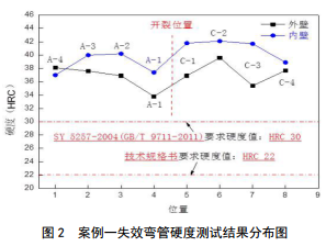 從開(kāi)裂位置向兩側每隔20 mm分別在內壁和外壁測試5個(gè)硬度值,結果如圖 2所示?梢钥闯鰪澒芏斡捕戎禐32~42 HRC,內層和外層硬度值均遠高于標準和技術(shù)規格書(shū)要求。