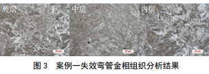 金相組織如圖 9所示,熱煨彎管外層組織為典型的魏氏組織,并存在少量馬氏體,晶粒粗大,為彎制過(guò)程熱輸入效應下,奧氏體晶粒長(cháng)大后,在較快的冷卻速度下形成的鐵素體針片+珠光體組織,組織的綜合性能較差,韌性降低,脆性增加,開(kāi)裂敏感性增加。與外層和中間層組織相比,內層組織較為均勻,以鐵素體和珠光體相為主。