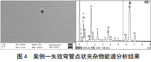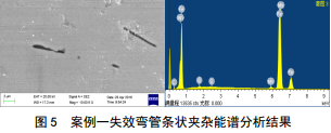 金相組織如圖 3所示,熱煨彎管開(kāi)裂位置附近為典型的馬氏體組織,外表面馬氏體板條粗大,越靠近管壁內表面,板條束越小。說(shuō)明彎管在彎制過(guò)程中,管外壁的受熱溫度高于其它位置。在金相組織照片中可以明顯觀(guān)察到組織中有球狀和條狀夾雜物。能譜分析結果顯示球狀物為CaO-Al2O3系復合夾雜物,如圖 4所示;條狀夾雜為MnS夾雜,如圖 5所示。