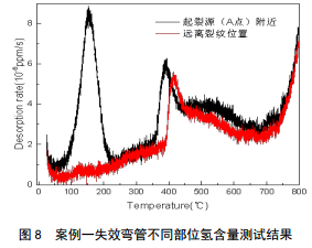 分別在裂紋源附近(A點(diǎn))和遠離裂紋位置取樣,使用升溫脫氫分析設備(Thermal DesorptionSpectroscopy, TDS)對兩個(gè)位置樣品中氫隨溫度溢出曲線(xiàn)及氫含量進(jìn)行測試。測試結果如圖 8所示,不同條件下的釋氫曲線(xiàn)均存在兩個(gè)峰值,第一個(gè)峰值出現在100 ℃附近,第二個(gè)峰值出現在400 ℃附近,根據釋氫曲線(xiàn)將測試獲得的氫分為兩部分,一部分為較低溫度逸散出的可擴散氫,另一部分為達到較高溫度后才能擺脫束縛散逸出來(lái)的陷阱氫。對釋氫曲線(xiàn)進(jìn)行積分,起裂源處可擴散氫為0.025 mg/kg(ppm),陷阱氫為0.052 mg/kg(ppm);遠離裂紋位置可擴散氫為0.005 mg/kg (ppm),陷阱氫為0.045mg/kg(ppm)。從測試結果可以看出,起裂源位置的可擴散氫含量和陷阱氫含量均高于遠離裂紋位置,其中,起裂源處的可擴散氫含量比遠離裂紋位置的值高出一個(gè)數量級。管道內部含有硫化氫介質(zhì),提供了氫的來(lái)源,氫容易在應力集中位置富集,裂紋源位置的氫含量升高,進(jìn)一步證明了起裂過(guò)程中氫的作用。