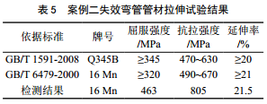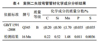 16 Mn是舊國標GB/T 1591―1988中低合金高強度結構鋼牌號,新國標GB/T 1591―2008中為Q345B(Q345有5個(gè)質(zhì)量等級, Q345A~Q345E);瘜W(xué)成分測試結果如表 4所示,,其中管材的C含量和Si含量略高于標準要求,該成分的增加使材料的屈服強度和抗拉強度升高,其他化學(xué)成分符合標準要求。