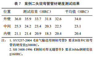 開(kāi)裂位置附近的硬度測試結果如表7所示,開(kāi)裂彎管外表面的硬度測試結果高于標準要求。