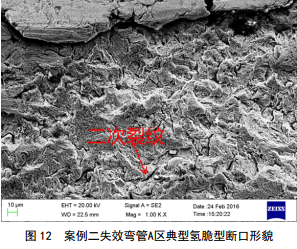 在掃面電鏡下觀(guān)察,在管壁外表面P1和P2處發(fā)現裂紋起源點(diǎn),如圖 11所示,起源點(diǎn)位于亞表面,從外向內呈放射狀擴展。將斷口放大后觀(guān)察到A區為典型的沿晶斷口,并伴有二次裂紋,屬于典型的氫脆型斷口,如圖 12所示。 B區為A區裂紋擴展后產(chǎn)生應力集中,應力作用下的準解理斷口, C區為最后快速斷開(kāi)的剪切唇。