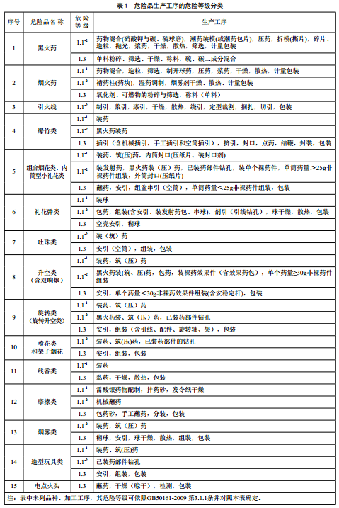 根據GB 50161―2009《煙花爆竹工程設計安全規范》,煙花爆竹企業(yè)危險性建筑物(工房)的危險等級劃分為1.1級、 1.3級(表 1、表 2)。