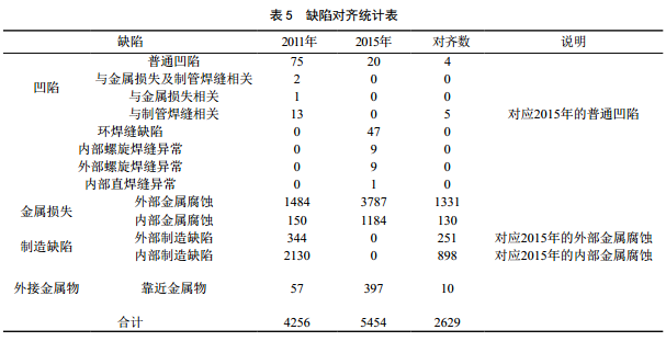 2015年與2011年的檢測商不同,在缺陷分類(lèi)上存在一定差別。人工根據位置判斷以下類(lèi)別為同一缺陷:即對正常管段內的缺陷進(jìn)行對齊,參數為里程容差0.4 m,時(shí)鐘方位小于45:00可接受,共對齊2 629個(gè)缺陷,對齊率48.2%(表 5)。