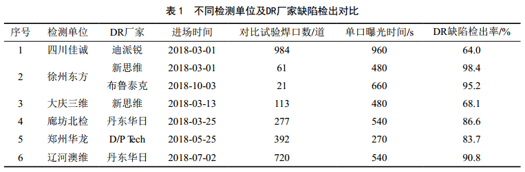 DR在閩粵支干線(xiàn)上優(yōu)先檢測金口、連頭焊口、返修以及穿越焊口。 DR檢測在數據儲存和傳輸、圖譜的數字化分析及圖像靈敏度方面更加具有優(yōu)勢。不同檢測單位及DR廠(chǎng)家缺陷檢出對比見(jiàn)表 1。