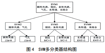 分類(lèi)器構造即在整體結構中,先將相似量作為一類(lèi),然后根據相似量之間的細微變化,再通過(guò)模型算法進(jìn)行區分。管道建設期和運行期焊縫中存在的裂紋、夾渣、氣孔、弧坑、未焊透、未熔合、咬邊等缺陷,不同缺陷的灰度差∆h、等效面積S/C、圓形度e、熵ENT、對比度CON等相關(guān)度等參數不盡相同,利用這些特征參數建立SVM多分類(lèi)(圖 3、圖 4)。