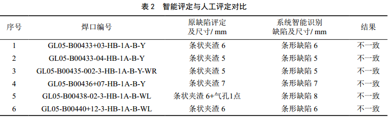 將環(huán)焊縫焊接缺陷智能評定系統實(shí)際應用于坪山—前灣天然氣管線(xiàn),發(fā)現與人工評定不一致處,主要為將條狀夾渣評為條狀缺陷(表 2)。