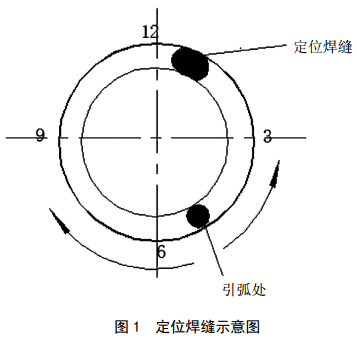定位焊縫一處,分布在管圓周11點(diǎn)鐘或1點(diǎn)鐘方向,長(cháng)度<15 mm,間隙3.0~3.5 mm。必須按工藝要求焊接定位焊縫, 6點(diǎn)鐘、 12點(diǎn)鐘方向不允許有定位焊,保證質(zhì)量、兩端修磨(圖 1)。