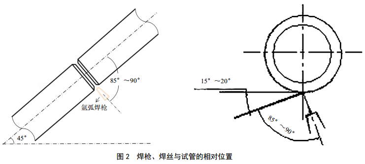 (3)焊槍、焊絲與試管的相對位置。鎢極與管體兩側分別成85°~90°;焊絲與管體切線(xiàn)方向成15°~20°,與鎢極成85°~90°,如圖 2所示。