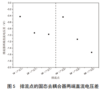 圖 4為固態(tài)去耦合器的直流漏流量的最大值、最小值和平均值,測試結果顯示,產(chǎn)品1的直流漏流量在﹣7 mA~+19 mA(正值表示電流通過(guò)排流地床流出),產(chǎn)品2的直流漏流量在﹣3 mA~+720 mA,其中5#和6#排流點(diǎn)通過(guò)的直流漏流量大。圖 5為固態(tài)去耦合器兩端的直流電壓差,可以看出, 6處直流電壓差均在規定的隔離電壓范圍內(﹣3 V~+0.3 V),但是2家產(chǎn)品的直流漏流量均大于規定的參數(大于1 mA)。