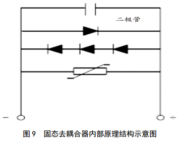 固態(tài)去耦合器主要由電容、二極管(或者晶閘管)以及浪涌保護裝置并聯(lián)組成。其中電容元件用來(lái)導通交流電流;二極管(或者晶閘管)用于控制固態(tài)去耦合器兩端的直流電壓差,在二極管(或者晶閘管)的閾值范圍內,直流不導通,在兩端電壓差超過(guò)閾值范圍后,二極管(或者晶閘管)導通;浪涌保護裝置用于導通故障電流或者雷擊電流,防止電容和二極管(晶閘管)受故障或者雷擊電流的影響。不同廠(chǎng)家固態(tài)去耦合器的參數如表 1所示,其中額定隔離電壓指固態(tài)去耦合器兩端電壓差。在此范圍內,導通的直流電流小于規定的1 mA。如額定隔離電壓為﹣3 V/+1 V,表示兩端的電壓差在﹣3 V~+1 V范圍內,導通的直流電流小于1 mA;兩端電壓差小于﹣3 V和大于+1 V時(shí),導通的直流電流大于1 mA。