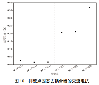 固態(tài)去耦合器兩端的交流電壓差是由通過(guò)的交流和其交流阻抗決定。排流量大和交流阻抗較大時(shí),都會(huì )造成其兩端的交流電壓差大。圖 10為各個(gè)排流點(diǎn)的固態(tài)去耦合器交流阻抗測試結果,可以看出產(chǎn)品2的交流阻抗遠大于產(chǎn)品1, 6#排流點(diǎn)交流阻抗達到 0.37 Ω,如排流點(diǎn)的電流達到產(chǎn)品標稱(chēng)的80 A時(shí),固態(tài)去耦合器兩端的交流電壓差將達到29.6 V,在影響管地電位的同時(shí),也將影響排流點(diǎn)的排流效果,因此在排流量較大時(shí),固態(tài)去耦合器的交流阻抗直接影響排流效果。