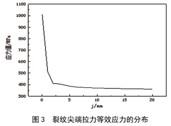 以含有表面裂紋的高強度管線(xiàn)鋼材X80管道為研究對象。在管道中心部位,模擬一個(gè)三維表面裂紋,裂紋長(cháng)度40 mm、深度4 mm、寬度1 mm,采用ANSYS 軟件建立有限元模型。由于上述研究對象具有嚴格的對稱(chēng)性,為了減少計算量,加快計算速度,取研究對象的四分之一作為分析模型。所建有限元模型如圖 1所示。仿真時(shí),在模型兩側平面分別施加位移約束,即模型兩側位移為0,施加10 MPa內壓后對仿真結果進(jìn)行應力云圖查看,裂紋處應力云圖如圖 2所示。從圖 2中可以看出應力的最大值出現在裂紋尖端,提取裂紋處及其附近應力值,如圖 3所示, j為距裂紋尖端的距離?梢钥闯,沿著(zhù)裂紋方向,隨著(zhù)距裂紋尖端的距離不斷增大,應力值越來(lái)越小。