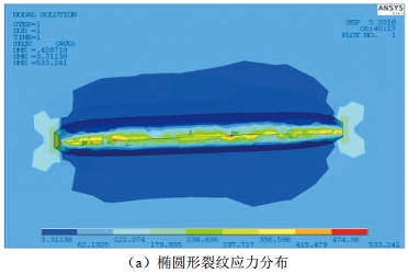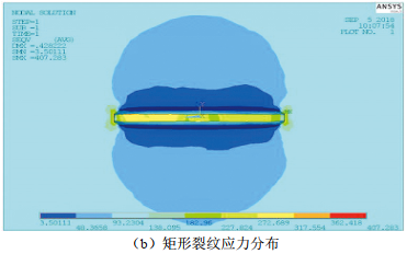 通過(guò)ANSYS分別建立橢圓形裂紋和矩形裂紋模型,裂紋尺寸為長(cháng)30 mm、深3 mm、寬1 mm,施加3 MPa內壓,為增加長(cháng)徑比,消除端部效應,管道長(cháng)度設為5 000 mm。對不同斷面形狀裂紋進(jìn)行仿真得到的應力云圖如圖 4所示。提取各仿真過(guò)程中的裂紋尖端應力值見(jiàn)表 1。