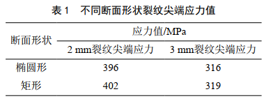 由表 1可知,當裂紋深度、長(cháng)度、寬度一定時(shí),不同形狀的裂紋尖端應力變化不大。