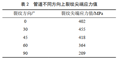 由表 2可知,隨著(zhù)裂紋方向與管道軸向方向夾角增大,裂紋尖端應力值先增大后減小。相同內壓下,同樣尺寸的周向裂紋尖端應力值遠小于軸向裂紋尖端應力值,約為軸向的一半。