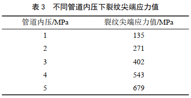 由表 3可知,隨著(zhù)管道內壓增大,裂紋尖端應力值隨之線(xiàn)性增大。