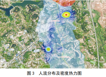 系統利用LBS數據倉庫,建立LBS數據模型,統計分析油氣管道監視區域內活動(dòng)人員流量及活動(dòng)人員的行為特征,估算出人員流量情況、人員出現時(shí)間、滯留時(shí)間,距管道距離等,為油氣管道周界內的安保工作提供指引。通過(guò)統計分析LBS位置大數據,并在地理信息系統(GIS)上以直觀(guān)、可視化的色度表達形式(“熱力圖”)展示監視區域內的人流量估值、人流量密度、人流分布、人流實(shí)時(shí)軌跡及軌跡回放等信息(圖 2、圖 3、圖 4)。