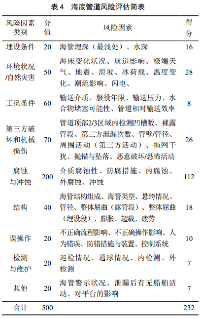 風(fēng)險因素評分項[7-9]如表 4所列9類(lèi),采用半定量評價(jià)方法確定海底管道的風(fēng)險分值、風(fēng)險等級(表 4)。