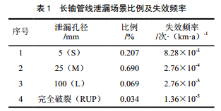 失效頻率的確定普遍采用同類(lèi)設備的歷史統計數據,經(jīng)數據來(lái)源及可靠性分析后,應用相關(guān)理論模型進(jìn)行事故發(fā)生概率計算,然后結合項目實(shí)際情況進(jìn)行修正采用。國外可供查閱的設備失效數據庫較多,而國內在這方面的數據積累相對較少。天然氣輸送管道的基礎失效頻率來(lái)自GB 32167―2015《油氣輸送管道完整性管理規范》附錄G推薦的輸氣管道泄漏頻率,其頻率為4×10﹣4次/(km·a)。管道的泄漏場(chǎng)景由SY/T 6714―2008《基于風(fēng)險檢驗的基礎方法》和SY/T 6859―2012《油氣輸送管道風(fēng)險評價(jià)導則》定義,管道的泄漏場(chǎng)景選取如表 1所示。