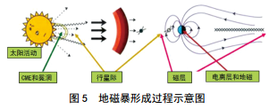 眾所周知,太陽(yáng)活動(dòng)會(huì )形成太陽(yáng)風(fēng),當太陽(yáng)風(fēng)攜帶大量等離子體到達地球磁層,地球磁層與電離層的相互作用會(huì )引起地磁場(chǎng)的劇烈擾動(dòng),一系列空間天氣的變化從而引發(fā)劇烈的地磁擾動(dòng)——地磁暴,如圖 5所示。