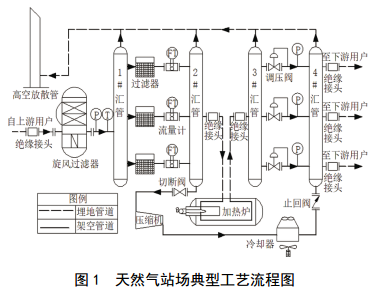 天然氣站場(chǎng)包含過(guò)濾區、調壓區、計量區、加熱爐區、加壓區、排污區等單元。過(guò)濾區主要是對進(jìn)入站場(chǎng)的天然氣進(jìn)行初步雜質(zhì)過(guò)濾,經(jīng)過(guò)調壓區降低管道內天然氣壓力和溫度,空氣中的水分冷凝于管道外,易形成腐蝕環(huán)境。加熱爐區通過(guò)水浴式加熱爐提高天然氣的溫度,有效解決調壓區“冒汗”問(wèn)題[2]。天然氣站場(chǎng)典型工藝流程如圖 1所示。