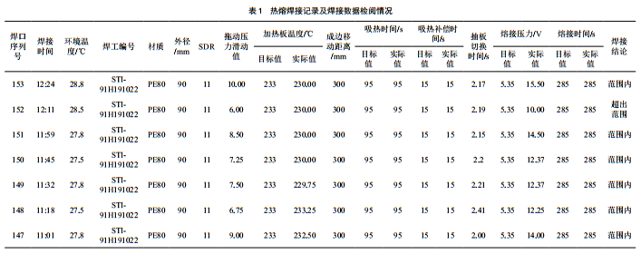 熱熔焊接數據通過(guò)接口傳到TMS系統后,系統首先對焊接數據進(jìn)行解碼,同時(shí)自動(dòng)根據上述公式對Pg進(jìn)行判斷,如超過(guò)目標范圍,則系統提示焊接結果超出范圍。此外,系統還將焊口號、加熱板溫度、抽板切換時(shí)間、加熱時(shí)間、冷卻時(shí)間等參數數字化并在系統中永久保存,以便追溯。如某公司上傳至TMS系統的焊接數據,系統校驗發(fā)現界面凈作用力Pg超出范圍,據此判定該臺熱熔焊機可能存在質(zhì)量問(wèn)題,要求對熔接壓力超標的焊口做進(jìn)一步的外觀(guān)檢查,必要時(shí)做破壞性試驗,并要求使用者及時(shí)聯(lián)系焊機供應商進(jìn)行檢修。表 1為某公司熱熔焊接記錄及焊接數據檢閱情況。