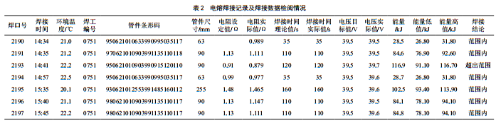 TMS系統中電熔焊接數據是以某管件實(shí)際焊接能量值與管件供應商提供的標準能量范圍相比較進(jìn)行校驗,要求管件供應商通過(guò)大量試驗及結合設計方案確定該管件焊接能量范圍,同時(shí)系統記錄焊口號、焊接電壓、焊接時(shí)間、電阻值等其他焊接參數數字化數據并在系統中永久保存,以便追溯。對于能量超范圍 的焊口要求施工方、監理方著(zhù)重進(jìn)行外觀(guān)檢查,必要 時(shí)進(jìn)行破壞性試驗,同時(shí)也對管件供應商供貨的一致性、焊機性能的穩定性進(jìn)行了復核和校驗。表 2為電熔焊接記錄及焊接數據檢閱情況。