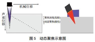 超聲相控陣檢測技術(shù)一般通過(guò)控制參與波束形成的發(fā)射和接收探頭陣列單元以及對應每個(gè)單元的發(fā)射器和接收器的時(shí)間延遲規則和激勵電壓幅度來(lái)形成自己的聚焦法則[3]。目前主要采用動(dòng)態(tài)聚焦,如圖 5所示,超聲聲束沿聲束軸線(xiàn),在發(fā)射時(shí)使用單個(gè)聚焦脈沖,在接收時(shí)通過(guò)計算對所有深度進(jìn)行編程深度聚焦,實(shí)現對不同深度進(jìn)行聚焦掃描。最新技術(shù)是實(shí)時(shí)全聚焦(TFM)成像檢測, TFM是一個(gè)信號處理算法,利用全矩陣采集TFM的數據來(lái)對缺陷的位置及外形尺寸進(jìn)行精確成像。