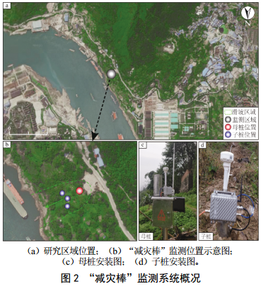 “減災棒”監測預警系統由四個(gè)部分組成:“減災棒”監測系統、無(wú)線(xiàn)數據傳輸系統、大數據管理計算中心、可視化監測預警平臺,如圖 1所示!皽p災棒”是由母樁和子樁組成的監測設備,母樁和子樁按分布式位置構成“減災棒”監測網(wǎng)絡(luò )(圖 2)。無(wú)線(xiàn)數據傳輸系統采用433MHz/GPRS/3G/4G/NB-IoT等多頻段、多中繼冗余交叉組網(wǎng)技術(shù),以確保大數據量長(cháng)時(shí)間穩定工作。大數據管理計算中心依據監測數據進(jìn)行計算并構建了基于機器學(xué)習的決策模型用于智能預警。監測數據和預警信息通過(guò)可視化監測預警平臺直觀(guān)展示。
