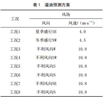 根據氣象條件,海底管道所在海域附近夏季盛行SE向風(fēng),冬季盛行NW向風(fēng),年主導風(fēng)向為SE向。按《船舶污染海洋環(huán)境風(fēng)險評價(jià)技術(shù)規范(試行)》要求,選取對主要敏感目標最不利的風(fēng)向為不利風(fēng)向,風(fēng)速為相應的年平均風(fēng)速。管道環(huán)境敏感區域位于管道北側、南側及東側,油污對周邊的海洋保護區造成危害為不利情況,故根據溢油點(diǎn)和環(huán)境敏感區域位置,試算后選擇不同的不利風(fēng)向分別為W、 SW、 S和N向風(fēng)[3]。故本次預測主要考慮SE向風(fēng)、 NW向風(fēng),以及不利風(fēng)向W、 SW、 S和N向風(fēng),風(fēng)速取多年平均風(fēng)速,不利風(fēng)向時(shí)取最大不利風(fēng)速10.8 m/s。選擇高平潮時(shí)刻進(jìn)行溢油預測,工況見(jiàn)表 1。