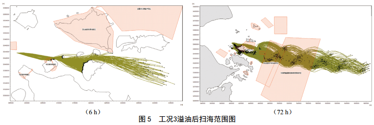 CB1發(fā)生溢油事故后,工況1(高平潮, SE風(fēng)向, 4.0 m/s風(fēng)速) 6 h掃海面積61.2 km2, 72 h后掃海面積為3 525.5 km2;工況3(高平潮, W風(fēng)向,10.8 m/s風(fēng)速) 6 h掃海面積195.7 km2, 72 h后掃海面積為8 026.8 km2(圖 5);工況4(高平潮, SW風(fēng)向, 10.8 m/s風(fēng)速) 6 h掃海面積93.8 km2, 72 h后掃海面積最大,為10 542.4 km2;工況6(高平潮, N風(fēng)向, 10.8 m/s風(fēng)速) 6 h掃海面積為8.2 km2, 72 h后掃海面積為759.5 km2(圖 6)。不同風(fēng)向對環(huán)境敏感區域溢油的響應時(shí)間各不相同,最快1 h溢油到達環(huán)境敏感目標區域,主要敏感目標中五峙山列島鳥(niǎo)類(lèi)自然保護區受影響最嚴重。