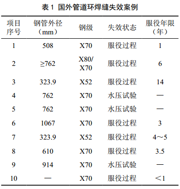 根據不完全統計,北美地區在過(guò)去2~3年內發(fā)生10次管道失效事故、多數為X70鋼級管道環(huán)焊縫失效,詳見(jiàn)表 1。