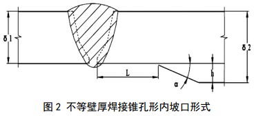 (4)改進(jìn)不等壁厚坡口設計。變壁厚處坡口焊接質(zhì)量差,易出現焊縫缺欠/缺陷和產(chǎn)生較大應力集中,當管道受到外部載荷作用時(shí),將一定程度擴大載荷應力。以中俄東線(xiàn)為例,對于常規內部打磨斜坡的不等壁厚坡口,應力集中系數在1.16~1.29之間。為減少應力集中,優(yōu)化焊縫成型質(zhì)量,結合應力計算結果,設計人員提出錐孔形坡口設計,即在厚壁管內部加工錐孔形坡口以實(shí)現等壁厚對接的目的,詳見(jiàn)圖 2。采用該圖形式的坡口,不同壁厚組合計算得到的應力集中系數在1.04~1.08之間。