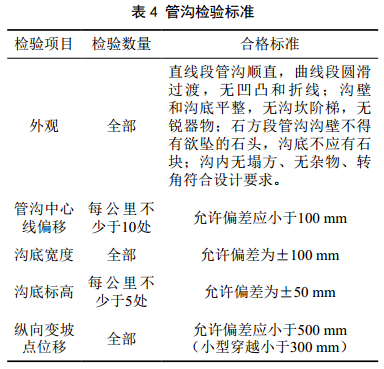 增加特殊地段溝底標高檢驗數量:①縱向彈性敷設段每10 m測一點(diǎn);②所有的縱向變坡點(diǎn)及水平轉角點(diǎn)均須檢驗,且每處至少測三點(diǎn)(始點(diǎn)、中點(diǎn)和終點(diǎn));③河流、溝渠開(kāi)挖穿越段除所有的縱向變坡點(diǎn)外,穿越段每6 m測一點(diǎn)(含岸坡段);④所有田坎高、低點(diǎn)各測一點(diǎn);⑤判定管溝的溝深或管道埋深是否滿(mǎn)足要求的依據,應以管溝底標高或管頂標高為依據。