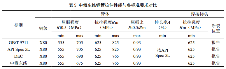 (2)縮小鋼管強度范圍。管材性能指標在已有設計及管材標準中均有規定。中俄東線(xiàn)對X80管線(xiàn)鋼屈服強度上限由705 MPa降為675 MPa,抗拉強度上限由825 MPa降為765 MPa,為管材與焊材強度匹配奠定了基礎(表 5)。