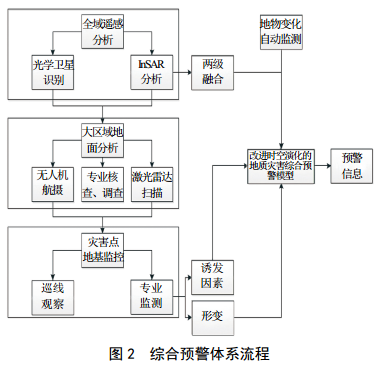 通過(guò)技術(shù)與管理相結合,建立天基系統、地基系統與地災風(fēng)險管控流程結合的天地聯(lián)合風(fēng)險管控體系,對地質(zhì)災害進(jìn)行“三查”(普(排)查、詳(篩)查、監查),實(shí)現地質(zhì)災害的天地一體化綜合監測預警,提高風(fēng)險管控能力和管控效率(圖 2)。