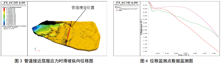 FLAC 3D數值模擬滑坡發(fā)育過(guò)程,在管道應力接近管材屈服應力時(shí)停止計算,得到滑坡整體位移以及位移監測點(diǎn)的數據變化如圖 3、圖 4所示;抡w縱向位移呈現坡度大、位移大的基本規律。由于該滑坡上半部分坡度最大,故最大位移位于滑坡體上半部分,在管道局部應力接近屈服極限時(shí),滑坡體最大縱向位移下降可達8.65 m左右。在該滑坡中部位置,由于地下輸氣管道的存在,阻礙了滑坡土體的下滑,上部下滑土體在此發(fā)生堆積,該位置土體出現了隆起,地表縱向位移最大增加2.2 m左右,與此同時(shí),管道也因此發(fā)生變形,管道應力迅速增加。該滑坡區域布置的三處縱向位移監測點(diǎn)都位于管道上部,在滑坡發(fā)育過(guò)程中,監測數據都先顯著(zhù)減小,然后略微反彈,維持一段平穩狀態(tài),然后監測位移迅速下降;在三處位移監測點(diǎn)中,粉色監測點(diǎn)維持平穩狀態(tài)最久,中間紅色監測點(diǎn)后期縱向位移變化最劇烈。因此在工程實(shí)際中,當三處監測點(diǎn)的位移迅速降低時(shí),需要密切關(guān)注管道安全狀況,對該處滑坡管道采取緊急防護措施,防止管道發(fā)生損壞。