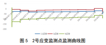 通過(guò)監測數據表明,2019年8月1日后,1號應變監測點(diǎn)和2號應變監測點(diǎn)數據變化不明顯(圖 4、圖 5),各點(diǎn)的整體趨勢基本一致,應變區間為﹣178~78,占極限值的7.73%,未達到關(guān)注級。