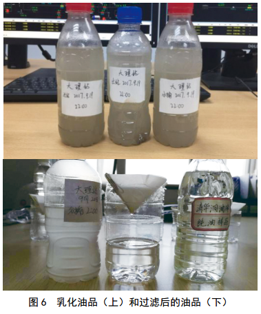 據此,大理站開(kāi)展現場(chǎng)實(shí)驗,使用濾紙過(guò)濾乳化油品,乳化現象明顯消除(圖 6)。根據實(shí)驗結果,建議下游銷(xiāo)售公司將罐內油品靜置5~7天,乳化現象基本消除。